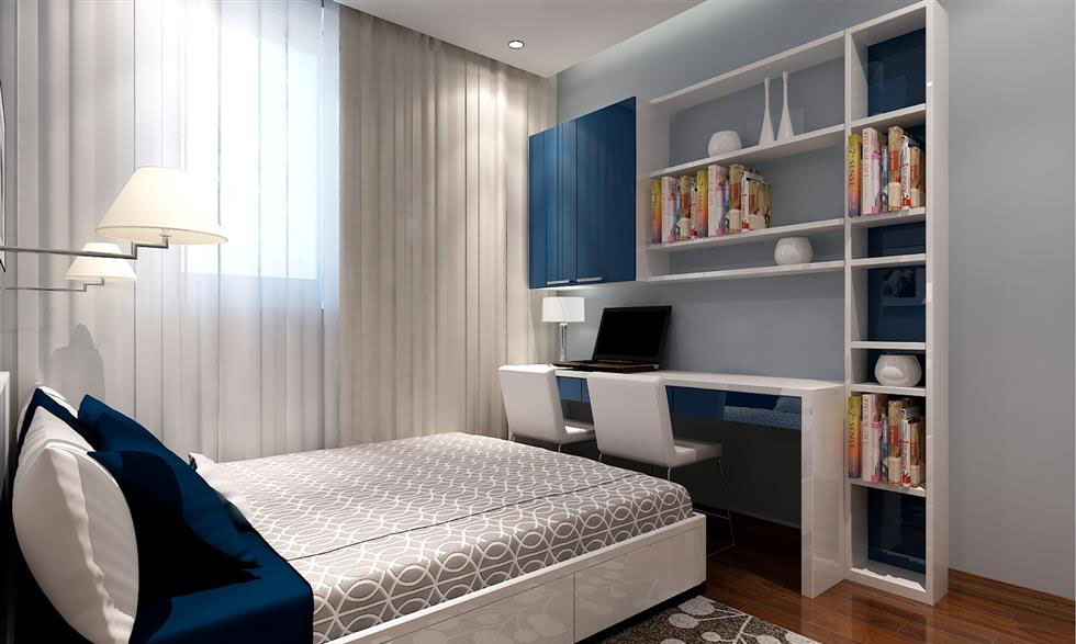 Phòng ngủ trẻ em mang sắc thái tươi sáng hơn rất nhiều so với phòng ngủ Master, với tông màu chủ đạo là trắng và xanh, rất phù hợp với tuổi trẻ. Do căn phòng có diện tích vừa phải và nhu cầu sử dụng của trẻ không nhiều nên các tiện ích và đồ nội thất khá tối giản, chỉ bao gồm các đồ thiết yếu như tủ quần áo, giường cỡ nhỏ, bàn học và giá sách.