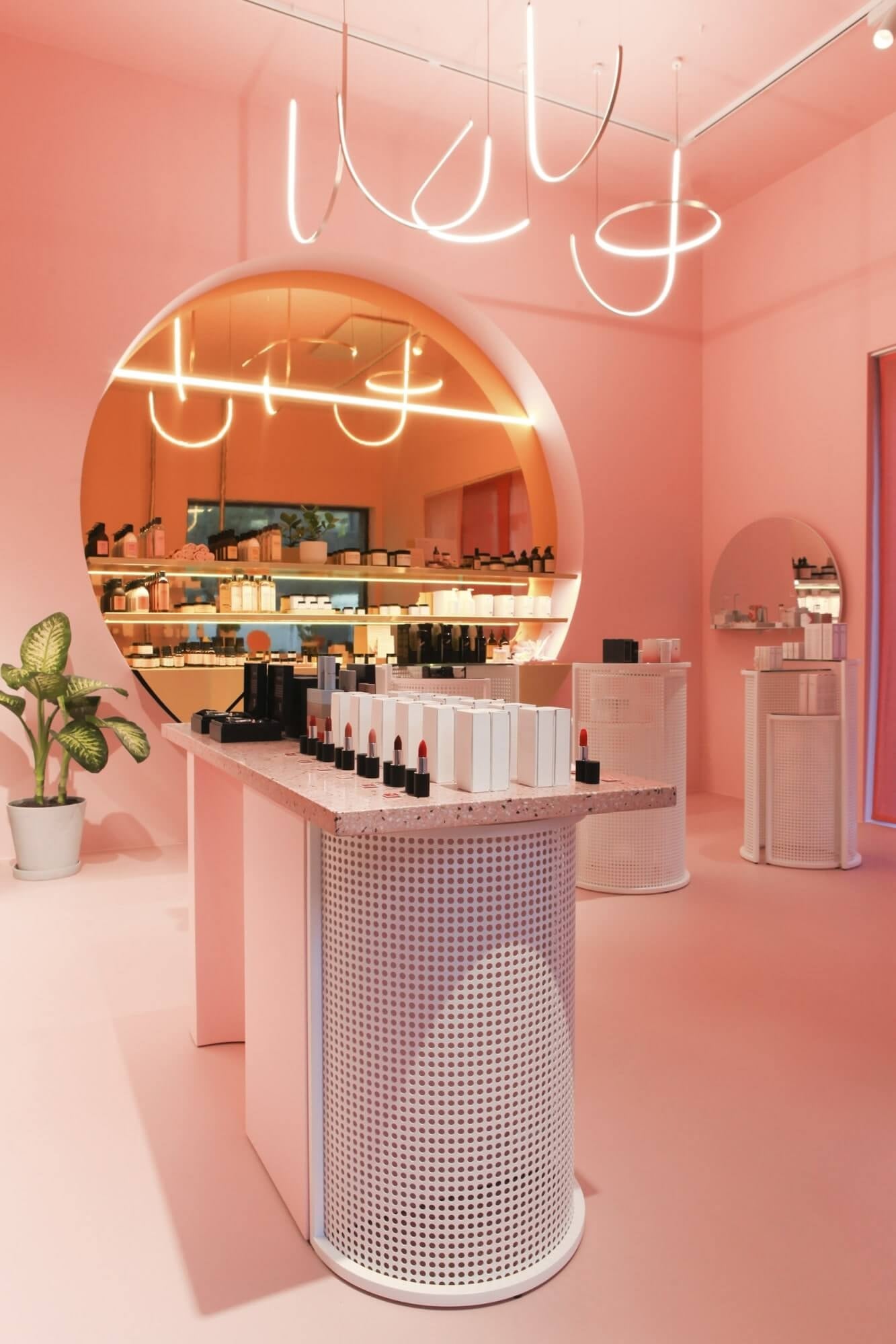 Phong cách thiết kế showroom mỹ phẩm với tone hồng nhẹ nhàng